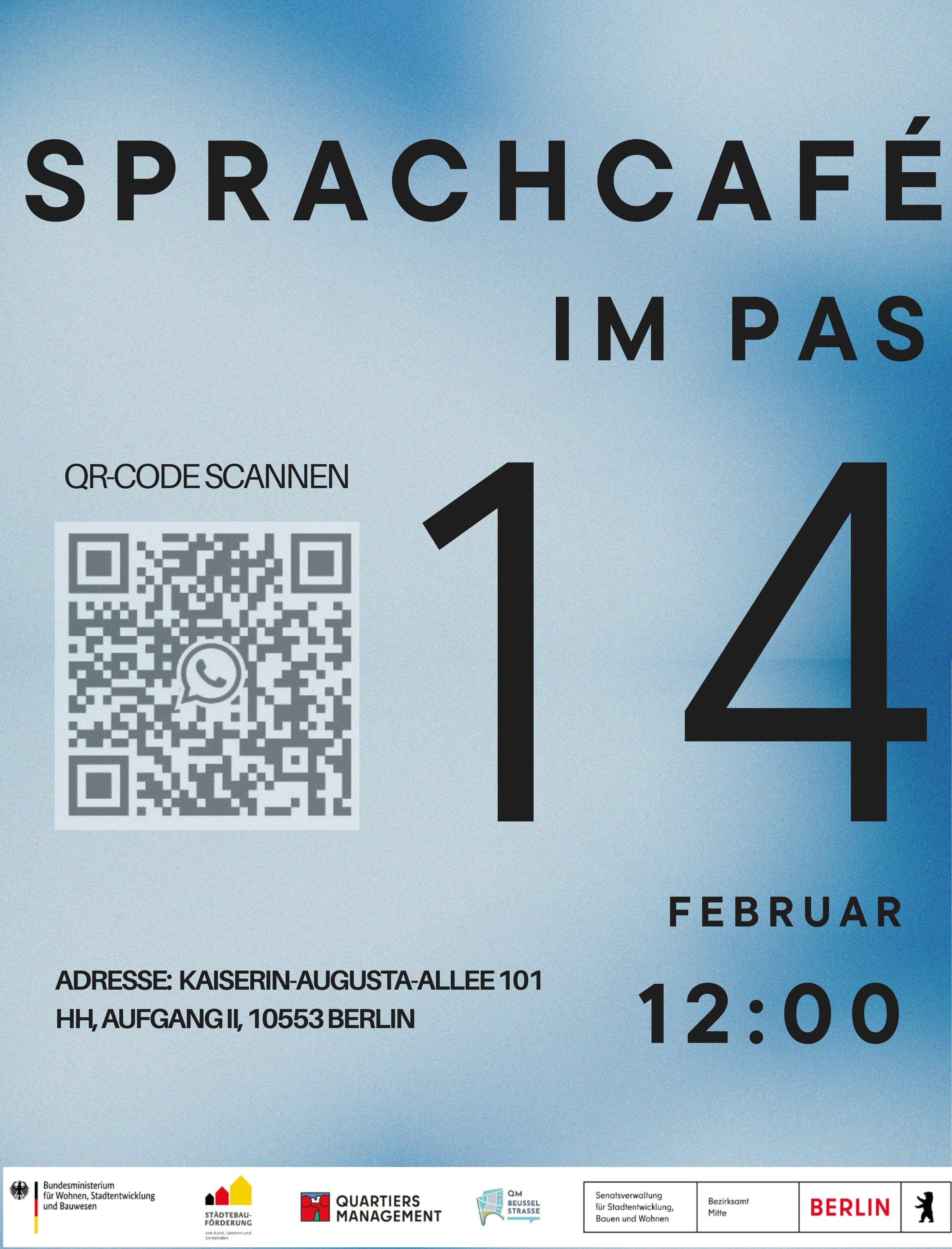 ☕🇩🇪 Sprachcafé im PASMöchtest du dein Deutsch üben und neue Leute kennenlernen? Komm vorbei und sprich Deutsch mit uns –in entspannter Atmosphäre und mit netten Gesprächen. 📅 24. Februar⏰ 17:30 Uhr📍 Kaiserin-Augusta-Allee 101, Innenhof, Aufgang II, 10553 Berlin 👉 QR-Code scannen & dabei sein!Alle Sprachniveaus sind willkommen 💬✨