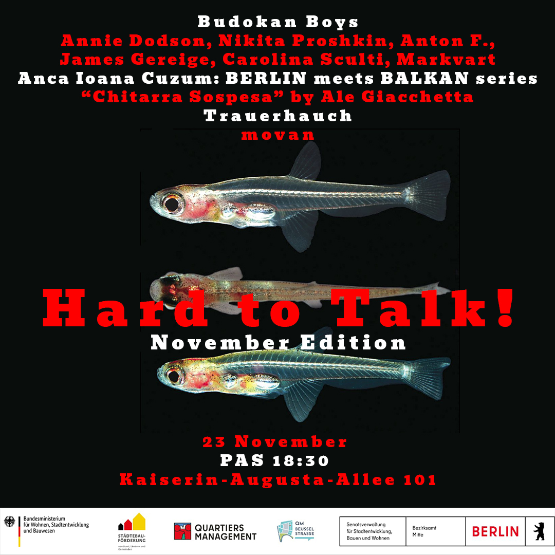 Updated line up and time!23 November, 18:30Hard to Talk! November edition Budokan BoysNikita Proshkin, James Gereige, Carolina Sculti, Anton F, Alexander MarkvartTrauerhauchNikita and Annie Dodsonmovan“Chitarra Sospesa” by Ale GiacchettaAnca Ioana Cuzum: BERLIN meets BALKAN series Entrance in the courtyard, Aufgang II, 1OGDoors 18:30 / music 19:00 more info:About Budokan BoysBudokan Boys is the trickster music project of two Americans, […]