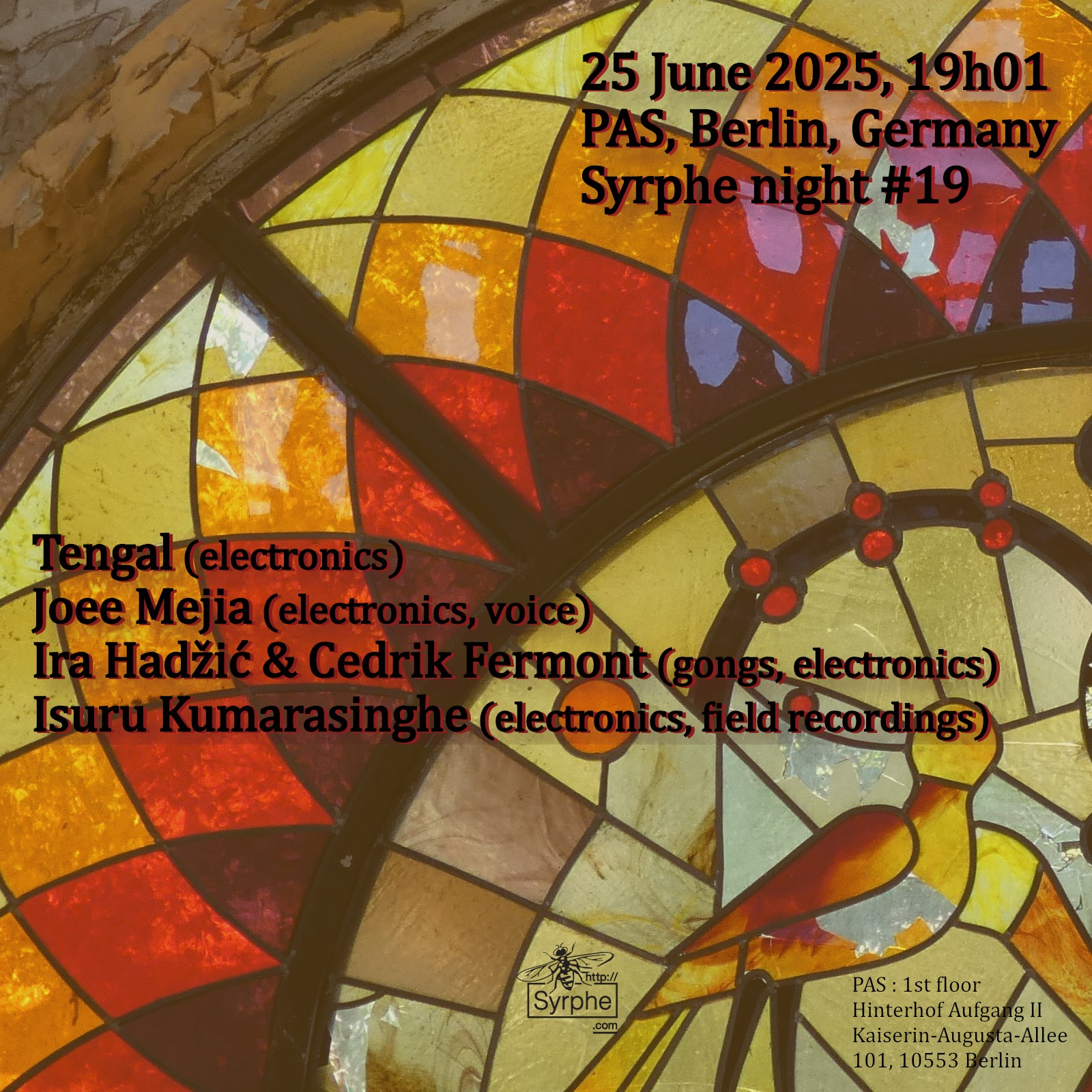 Syrphe Night #19, 25 June 2025 in #Berlin #Germany - Cedrik Fermont & Ira Hadžić ( #Belgium #DRC - #Germany ) https://syrphe.bandcamp.com/album/kenopsia- Tengal ( #Philippines ) https://soundcloud.com/tengal- Isuru Kumarasinghe ( #Sri Lanka ) https://soundcloud.com/isuru-kumarasinghe- Joee Mejias ( #Philippines ) https://soundcloud.com/joee-mejiasSound art, drone, electroacoustic music, field recordings, experimental and improvised music. Ira Hadžić is a Berlin-based sound artist, gong player, and writer working at the intersection of music, literature, and performance. […]