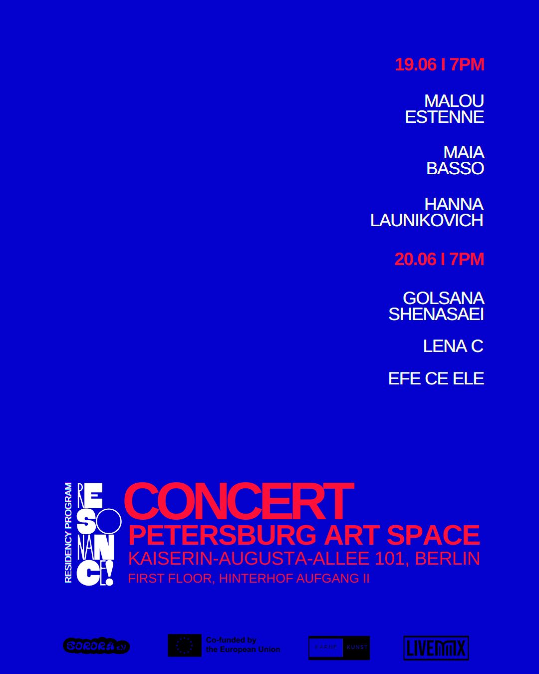 RESONANCE RESIDENTS IN CONCERTJune 19 and 20, 20257pm (doors)Artists:Malou Etienne / Maia Basso / Hanna Launikovich (a.k.a.mienskaja) / Golsana / Lena C. / EfeCe Ele 19.06Malou Etienne’s project Amal is an intimate spoken word performance, woven with poetry,about the political issues around the adoption system.@transtopiesMaia Basso will play her songs, along with occasional free interpretations […]