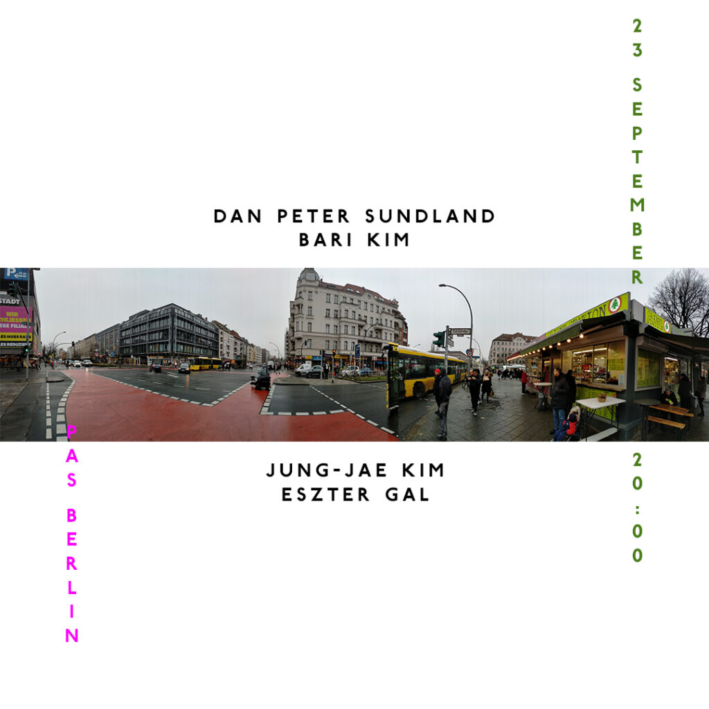 Monday concert: duo:Dan Peter Sundland – bassBari Kim – dance duo:Jung-Jae Kim – saxophoneEszter Gál – dance Entrance in the courtyard, Aufgang II, 1OGDoors 20:00, music a bit later.