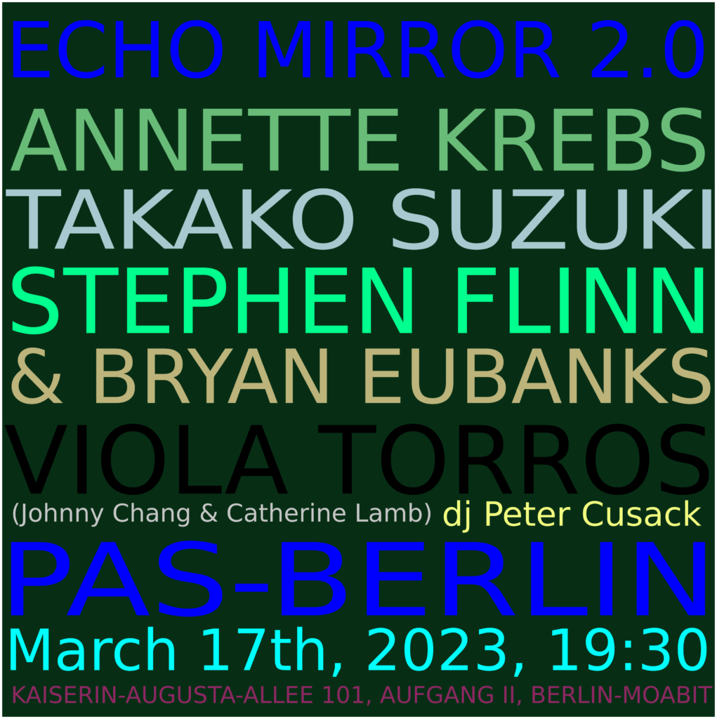 Friday March 17th, 20:00, doors 19:30 Echo Mirror 2.0 Annette Krebs – Konstruktion#4:Dadadystopian utility music made of rubber, metal, strings, objects, voice and live electronics//Stephen Flinn – gongs and percussionBryan […]