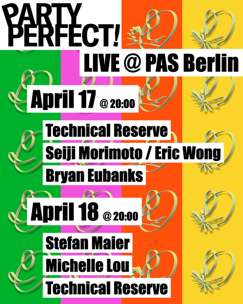Party Perfect Label Showcase at PAS Berlin Night 1, April 17th:Technical ReserveTechnical Reserve is the trio project of Hunter Brown, Dominic Coles, and T.J. Borden. Their singular improvisational language moves […]