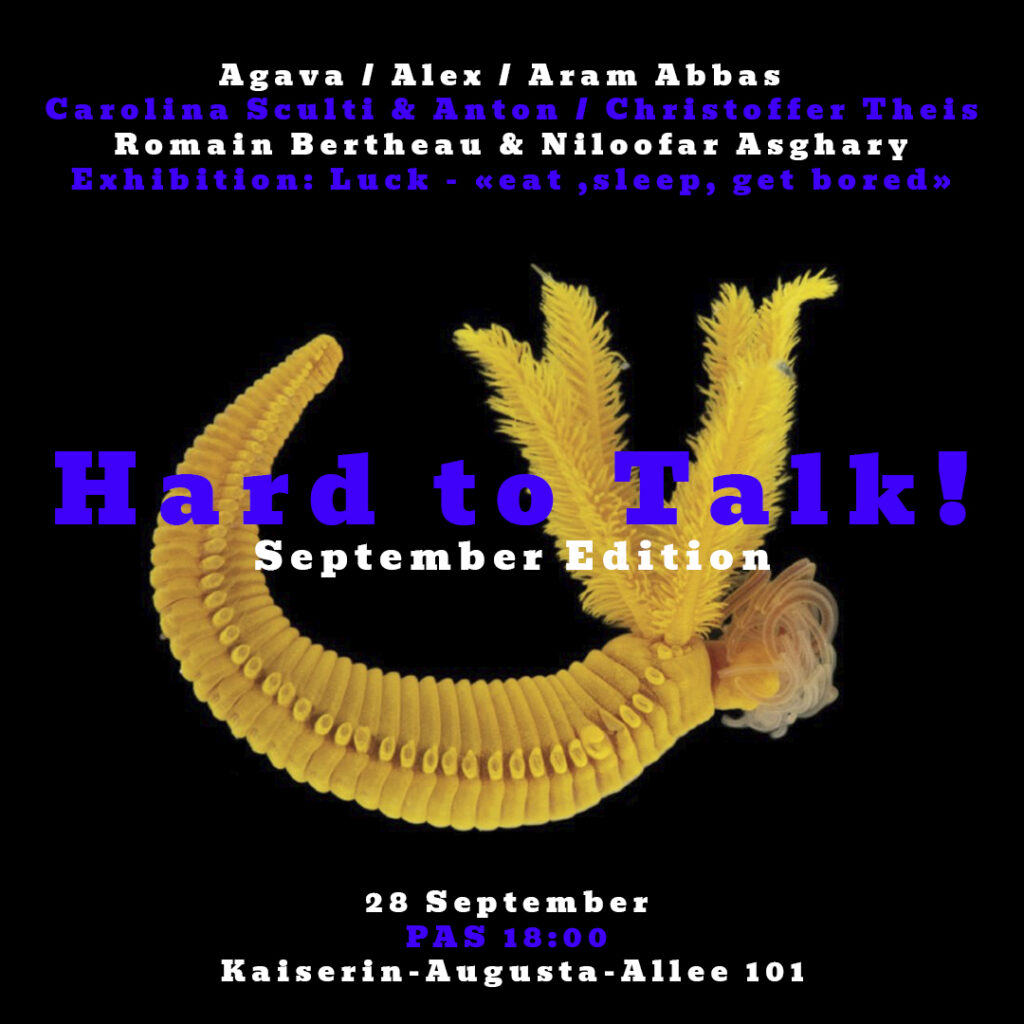 28 September, 18:00Hard to Talk! September edition…especially on the bottom of the ocean Exhibition: Luck – «eat ,sleep, get bored»Carolina Sculti & AntonChristoffer TheisAlexAram AbbasRomain Bertheau & Niloofar AsgharyAgava Entrance […]