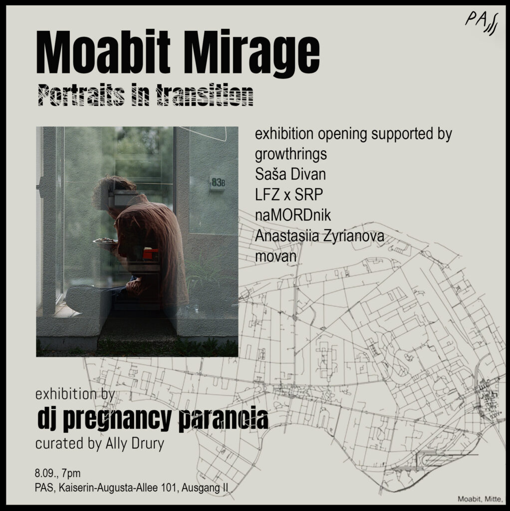 8 September, 7pm‘Moabit Mirage’ exhibition openingby dj pregnancy paranoiacurated by Ally Drury supported bygrowthringsSaša DivanLFZ x SRPnaMORDnikAnastasiia Zyrianovamovan poster by @past.oral