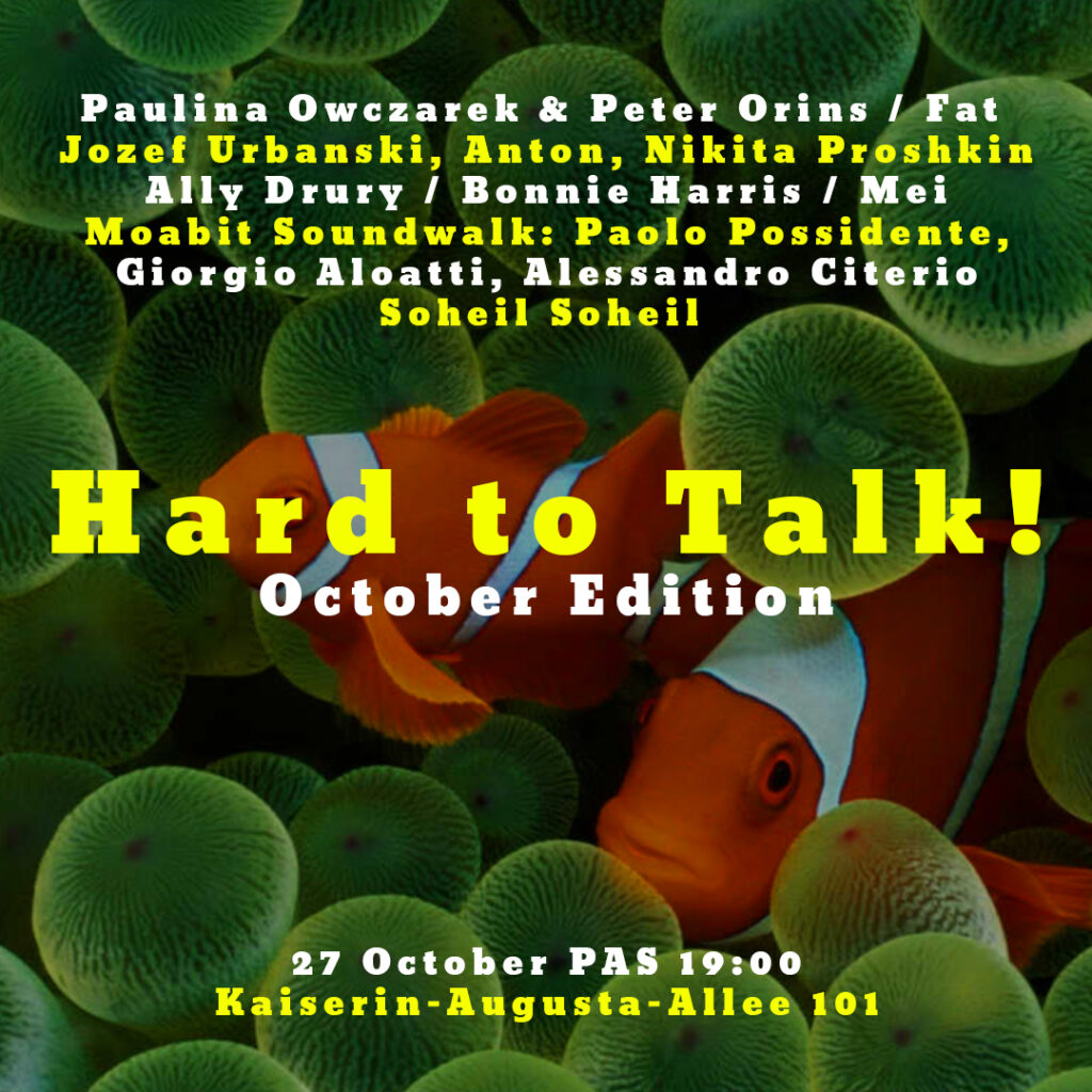 Hard to Talk! October Edition**** *- *-* -** – — – *- *-** -*- –**– Moabit Soundwalk presentation:Paolo Possidente, Giorgio Aloatti, Alessandro Citerio Paulina Owczarek – saxophonePeter Orins – drums […]