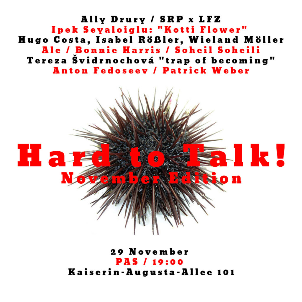 Hard to Talk! November edition. Ally Drury – live drawing Hugo Costa- alto saxIsabel Rößler – bassWieland Möller – drums Ipek Seyaloiglu“Kotti Flower” SRP x LFZvisceral voices, chants of liposuction and other […]