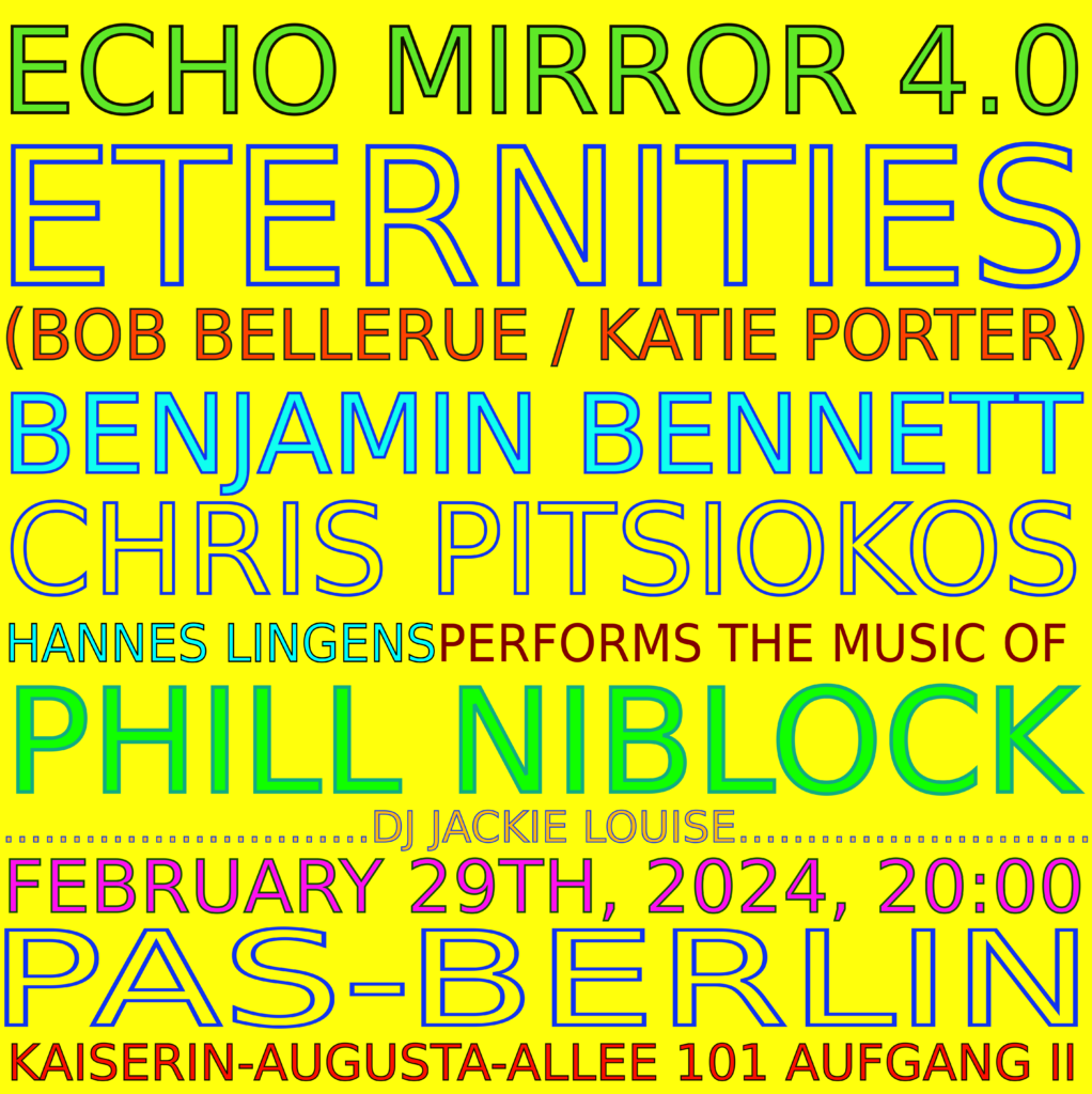 Echo Mirror 4.0February 29th, 2024, 20:00PAS-BerlinKaiserin-Augusta-Allee 101 (Aufgang II in the Hof)doors at 20:00, music at 20:30 First edition of ECHO MIRROR in 2024 with guests from the US and […]