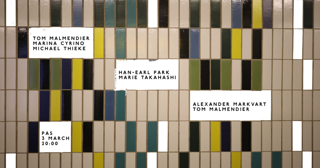 Sunday concert: Tom Malmendier – percussionMarina Cyrino – amplified flutesMichael Thieke – clarinet Han-earl Park – guitarMarie Takahashi – viola Alexander Markvart – feedback guitar, objectsTom Malmendier – percussion Entrance […]