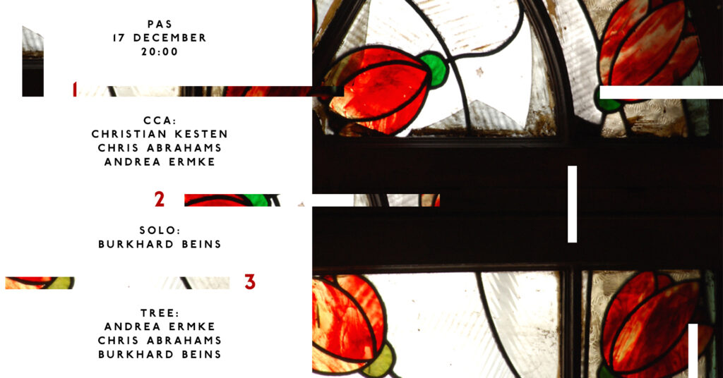 Sunday concert: 1. CCAChristian Kesten – voiceChris Abrahams – dx7Andrea Ermke – mini discs 2. SOLOBurkhard Beins – percussion 3. TREEAndrea Ermke – mini discsChris Abrahams – dx7Burkhard Beins – […]