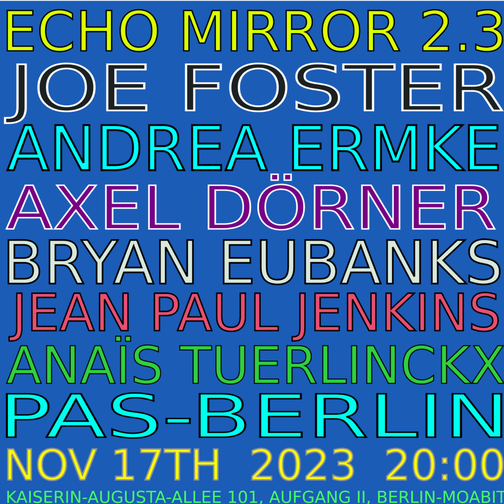 Echo Mirror 2.3 Joe Foster – trumpet, electronicsAndrea Ermke – mini disc recordings Jean-Paul Jenkins – guitar, electronicsAnaïs Tuerlinckx – prepared piano Axel Dörner – trumpet, electronics (quad)Bryan Eubanks – […]