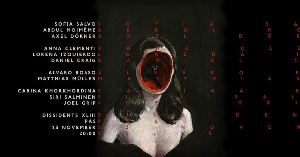 DISSIDENTS XLIII Sofia Salvo, baritone saxAbdul Moimême, electric guitar & objectsAxel Dörner, trumpet Anna Clementi, voiceLorena Izquierdo, voiceDaniel Craig, electronics Alvaro Rosso, double bassMatthias Müller, tombone Carina Khorkhordina, trumpetSiri Salminen, […]