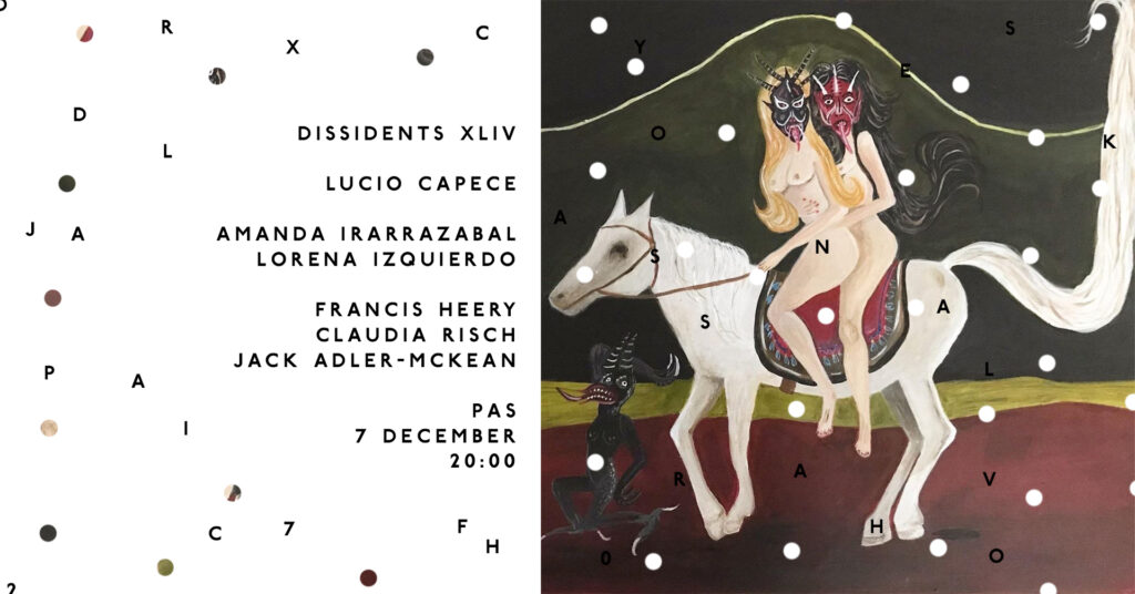 DISSIDENTS XLIV at PAS Lucio Capece, solo Amanda Irarrazabal, double bassLorena Izquierdo, action voice Francis Heery, electronicsClaudia Risch, bass clarinetJack Adler-McKean, feedback tuba Entrance in the courtyard, Aufgang II, 1OGDoors […]
