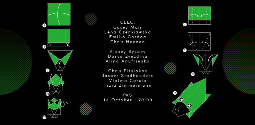 Monday concert: CLEC:Casey Moir – voiceLena Czerniawska – drawingEmilio Gordoa – vibraphoneChris Heenan – bas clarinet Alexey Sysoev – piano, electronicsDarya Zvezdina – electronicsAlina Anufrienko – cello Chris Pitsiokos – […]
