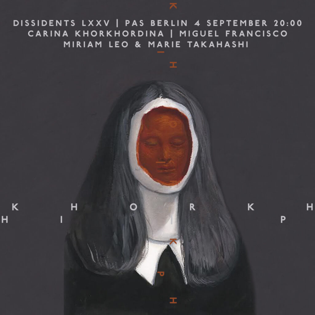 DISSIDENTS LXXV 1. Carina Khorkhordina, trumpet 2. Miguel Francisco, percussion 3. Miriam Leo, pianoMarie Takahashi, viola Entrance in the courtyard, Aufgang II, 1OGDoors 19:30, music a bit later