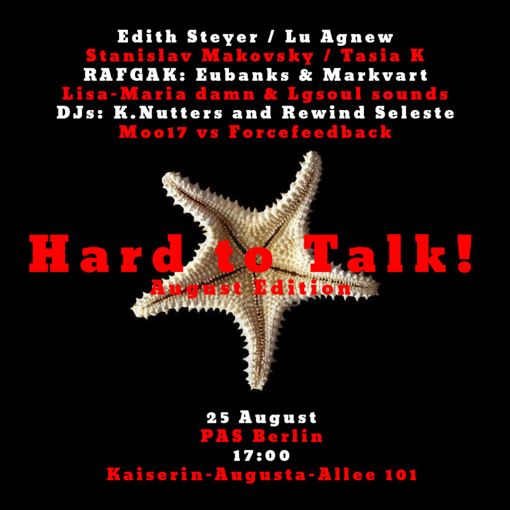 Hard to Talk! August Edition+ Music for the Cosmose−, νe, u, d, μ−, νμ, c, s, τ−, t, b, e+, μ+….. 17:00 Music for the Cosmos (outside set) Edith Steyer […]